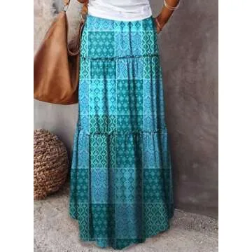 Happy Sailed Womens Retro Boho Printed High Waist Elastic Waist A Line Flowy Long Maxi Beach Skirts with Pockets Green XL