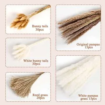 HappyHapi Dried Pampas Grass Decor, 110 PCS White & Brown Pampas Grass & Bunny Tails, Wedding & Home Decor
