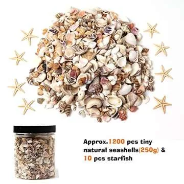 Show moreTransform your home and celebrations with the HAPY SHOP 1200 Pieces Tiny Sea Shells and Small Natural Starfish. This exquisite collection includes approximately 1200 tiny sea shells and 10 stunning starfish, handpicked from exotic beach locales. Each sea shell, ranging in size from 5 to 20mm, showcases the vibrant colors and unique textures of the ocean, making them perfect for enhancing your living space. The premium packaging ensures that every piece arrives in excellent condition, ready to elevate your DIY projects and decor.