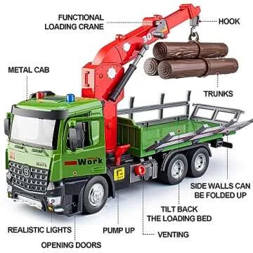 What makes this construction truck stand out is its simulated working features. The cab doors open and close, and the crane arm can pivot a full 350 degrees. There are options to raise and lower the arm using an air pump, plus it can telescope and lock into multiple positions for added functionality. Equipped with three tree trunks, kids can load and unload them, mimicking real-life construction activities.