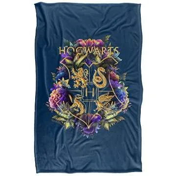 Show more Experience the enchanting world of Harry Potter with our Hogwarts Multi-Colored Floral Crest Ultra Silky Touch Throw Blanket. Measuring at a cozy size of 36" x 58", this beautifully crafted throw blanket combines style with extraordinary comfort. Made from high-quality, lightweight 300 GSM polyester fabric, it ensures warmth without the weight, making it a perfect companion for any cozy night in or a dazzling decorative statement for your room. The remarkably vibrant colors and intricate design are achieved through a dye sublimation process, ensuring your blanket not only looks stunning but also resists fading and shrinking, so it will be a cherished item for years to come.