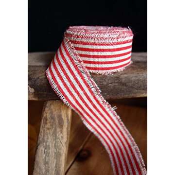 The frayed edges of this ribbon provide a rustic yet refined aesthetic, perfect for achieving that vintage or farmhouse look. Its striking red and off-white striped pattern is sure to catch the eye and can complement various color schemes. Whether you're crafting decorations for a seasonal occasion or simply looking to add some flair to your everyday items, this ribbon is a must-have in your crafting arsenal.