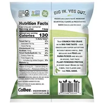 Show more Discover the ultimate snacking experience with Harvest Snaps, where we take pride in our mantra: Dig In. Veg Out. These vegetable chips and crisps have been carefully crafted to deliver the good stuff without compromising on flavor. With every bite, you can indulge in a snack that's not only delicious but also laden with wholesome goodness. Made from fresh veggies, our chips provide a satisfying crunch that’s sure to please snack lovers of all ages.