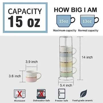 Show more Transform your coffee experience with the Hasense Stackable Coffee Mugs Set, a sophisticated collection designed not just for functionality but also for style. These charming mugs are crafted from pro-grade ceramic which is both lead-free and chip-resistant, ensuring durability that outlasts ordinary stoneware. With each cup featuring a lively, pastel design, they instantly brighten any kitchen or coffee station, making them a delightful addition to your home or a thoughtful gift for someone special.