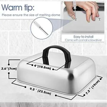 Show more The HaSteeL Melting Domes redefine your cooking experience with their superior quality and thoughtful design. Made of commercial grade stainless steel, these domes are not just durable but also food-safe, ensuring that they can handle direct contact with food without any worries of toxicity. With a robust thickness of 0.8mm, these domes are built to last, resisting dents and deformations even in the most demanding kitchen environments. The easy-to-clean and dishwasher-friendly surface means that you can spend less time on cleanup and more on enjoying your culinary creations.