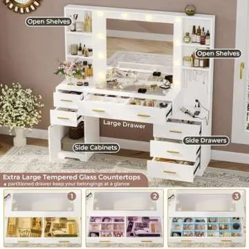 Show more This stunning white vanity set is designed with care and attention to detail, making it the perfect gift for anyone who loves to look their best. With an HD large makeup mirror, adjusting your makeup to find that perfect look has never been easier. The vanity is thoughtfully equipped with 10 LED bulbs featuring 3 different color modes: cool white, natural light, and warm yellow. Adjust the brightness according to your needs, whether you're preparing for a night out or just a casual day. This dressing table is not just a piece of furniture; it's a sanctuary for beauty enthusiasts!