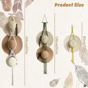 Show moreIntroducing the **Hat Holder Organizer Macrame Hat Rack**—a stunning and practical solution for your hat storage needs! Crafted from **high-quality pine wood**, this hand-woven, bohemian-style hat rack is designed not only for durability but also for aesthetic appeal. Whether you're a hat enthusiast or just starting your collection, this organizer allows you to elegantly display your hats while keeping them accessible and organized. With a **total length of 166cm (65 inches)** and a width of about **28cm (11 inches)** across three pieces, it's suitable for various types of hats ranging from soft beanies to sturdy panama hats.