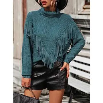 Show moreIntroducing the Hathne Women's Sweater Turtleneck Fringe Sweater Tops, the ultimate blend of style, comfort, and trendy design. Crafted with high-quality fabric, this pullover is not just an ordinary sweater; it's a fashion statement perfect for any occasion. The intricate triangle fringe detailing adds a touch of elegance, making this sweater a captivating addition to any wardrobe. It features a soft, cozy feel that embraces your skin while ensuring breathability, making it ideal for fall and cooler temperatures.