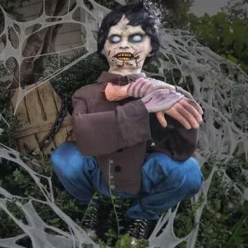 Show moreGet ready to elevate your Halloween celebrations with the Haunted Hill Farm Crouching Limb Eater Zombie Boy by Tekky. This Premium Life-size Animatronic Zombie is not just a decoration; it's a spine-chilling experience that brings your haunted house to life. Perfect for both indoor and covered outdoor display, this creepy prop adds an eerie touch to your porch, balcony, or any space that needs a terrifying upgrade. With its exceptional craftsmanship, this lifelike zombie is designed to withstand the elements, making it suitable for outdoor entertaining throughout the Halloween season.
