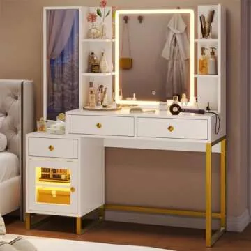 HAUOMS Makeup Vanity with Jewelry Cabinet & LED Lighted Mirror, Modern Vanity Desk with Charging Station, Double Mirror Vanity Table Set, White & Gold