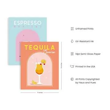 Show moreStep into a world where art meets flavor with the HAUS AND HUES Danish Pastel Posters Alcohol Poster Set. This enchanting collection features six vibrant cocktail-themed prints designed to infuse your living space with a splash of creativity and joy. Each poster elegantly showcases iconic cocktails such as espresso martinis, Aperol spritzes, whiskey sours, tequila sunrises, gin & tonics, and Moscow mules, all rendered in dreamy pastel palettes of blue, pink, orange, and green. Perfect for those looking to inspire and uplift their decor, these posters offer more than just wall art; they create an experience that enlivens every room in your home.