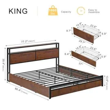 HAUSOURCE King Bed Frame with Storage Headboard and 4 Drawers Bed Frame King Size with Charging Station LED Lights Metal Platform Non-Slip Without Noise No Box Spring Needed