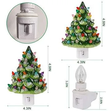 Show more Illuminate your holiday season with the Hausse 2 Pack Christmas Ceramic Tree Night Lights. These charming night lights, crafted from high-quality ceramic and intricately hand-painted, bring a touch of vintage elegance to your festive decor. Standing at a delightful 4.9 inches tall, each tree showcases a glossy finish that not only adds a festive glow but also ensures durability for long-term use. Equipped with a 7-watt clear light bulb, these night lights emit a bright, warm white light that transforms ordinary nights into enchanting starry evenings, making them an ideal companion for your holiday decor.