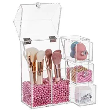 Show moreIntroducing the HBlife Makeup Brush Holder, the ultimate acrylic makeup organizer designed to elevate your beauty routine and your vanity's aesthetic. Crafted from premium 5mm thick clear acrylic, this durable and stylish storage solution is built to last, ensuring that your makeup essentials remain pristine and organized without turning milky over time. Featuring two well-structured brush holders and three spacious drawers, this all-in-one case is perfect for anyone who values both functionality and elegance in their beauty storage. Plus, each purchase includes charming pink pearl beans, an eye-catching decorative touch that keeps your brushes standing upright for easy access and stylish display.