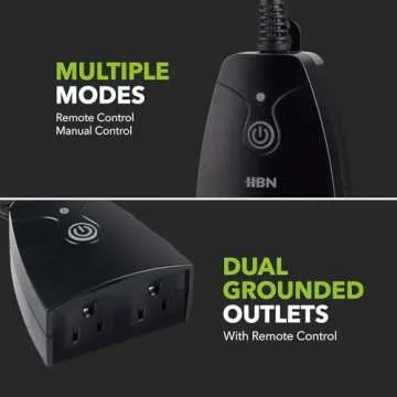 HBN Outdoor Indoor Wireless Remote Control Dual 3-Prong Outlet Weatherproof Heavy Duty 15 A Compact 2 Grounded Outlets with Remote 6-inch Cord 100ft Range ETL Listed (Battery Included)