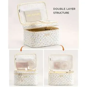 HBselect 2Pcs Double Layer Travel Makeup Bags - Cotton Quilted Coquette Kawaii Cherry Toiletry Bags for Women & Girls