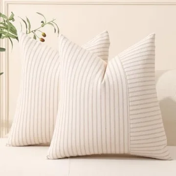 Show more Elevate your home decor with the Hckot Khaki and Beige Patchwork Farmhouse Throw Pillow Covers, an exquisite set designed to infuse elegance and coziness into your living space. Measuring a generous 18 x 18 inches, these pillow covers come in a set of two and feature a captivating striped patchwork design that will transform your sofa, armchair, or patio furniture. The delicate blend of khaki and beige tones radiates warmth while ensuring they seamlessly complement any decor theme, creating an inviting atmosphere regardless of the season.