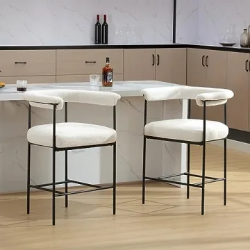 Show more Introducing the HEAH-YO Modern Sherpa Bar Stools Set of 2 - the perfect blend of style, comfort, and practicality. These 26-inch counter stools are designed with a chic boucle upholstery that not only adds elegance but also provides a plush feel, making every meal a delight. The slim black-finished iron framing ensures a lightweight and airy appearance, ideal for modern minimalistic interiors. Featuring a unique yoke back design, these stools bring an artistic flair while providing ample support for leisurely dining experiences. With dimensions of 22"L x 24.75"W x 35"H and a generously spacious 21"x19" seating area, they promise unparalleled comfort for everyone, weighing up to 250 lbs. Easy to clean, durable, and stylish; they are perfect for brightening up your kitchen island, dining room, or bistro setting.