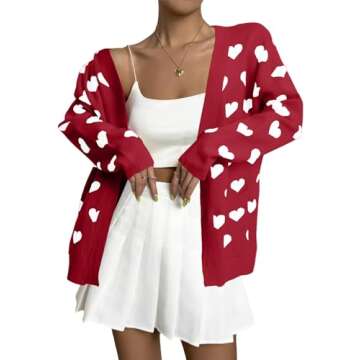 Heart Cardigan Sweater for Women Oversized Valentine Cardigan Cute Love Print Open Front Knit Sweaters Coat with Pockets Red