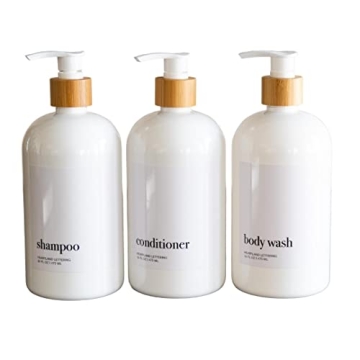 Show more Introducing the Heartland Lettering Shampoo and Conditioner Dispenser Set – the perfect combination of functionality and style for your modern bathroom. This set includes three elegant plastic bottles, each with a chic bamboo pump lid. Designed with convenience in mind, each bottle holds a generous 16 oz of your favorite shampoo or conditioner, helping you maintain a clutter-free space while adding a touch of sophistication. Standing at 8 inches tall (with the pump lid extended), and measuring 2.75 inches wide, these bottles are ideal for any size of the shower or bathtub area.