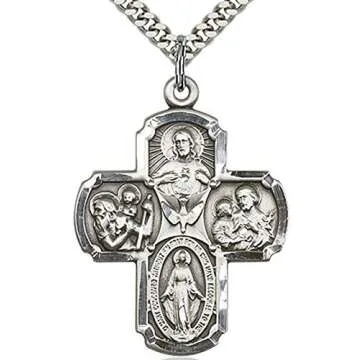 The uniquely crafted four-way cross pendant features sacred Catholic symbols, including the Sacred Heart, St. Christopher, St. Joseph, and the Miraculous Medal. These revered images offer deep spiritual symbolism, representing faith, guidance, and blessings. Thus, it serves not only as a beautiful accessory but also as a profound reminder of one’s beliefs.