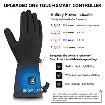 Introducing the Heated Glove Liners for Men and Women by SNOW DEER, the ultimate solution for keeping your hands warm during the coldest of conditions! Designed with the modern user in mind, these rechargeable battery heated gloves offer exceptional warmth and comfort. What sets them apart is the innovative smart controller that allows you to easily adjust the heat settings while featuring a battery power indicator with LED lights, showing you exactly how...