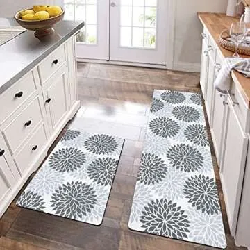 Show more Transform your kitchen with the HEBE Cushioned Kitchen Rug Sets, meticulously designed to enhance your living space with both style and functionality. This set includes two beautifully crafted rugs: a large mat ideal for kitchen spaces and a runner for hallways or laundry rooms. The rugs feature a stunning floral pattern that adds a touch of elegance while being remarkably practical. Made from high-quality materials, these mats offer unparalleled comfort underfoot and are perfect for anyone who spends long hours standing in their kitchen.