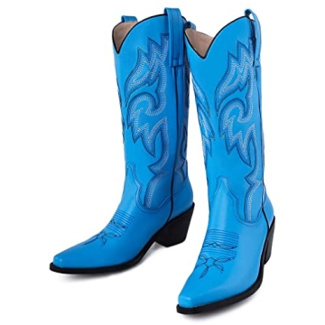 heelchic Womens Embroidered Cowboy Cowgirl Boots Snip Toe Chunky Heel Western Boots Pull On Mid Calf Boots