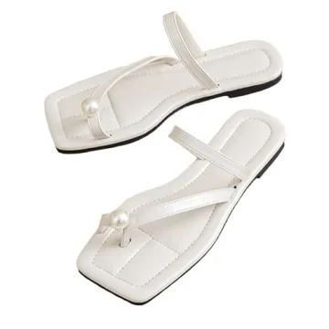Fashion Leather Pearl Decoration Toe Ring Slippers.