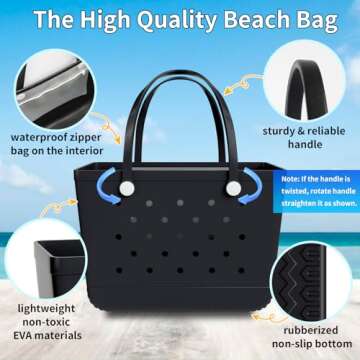 Heibbao X-Large Rubber Beach Bag Tote Bag with Waterproof Zipper Inner Bag, Washable Durable Tote Bag, Storage bags (Black)