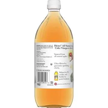 Show moreExperience the crisp, refreshing taste of Heinz All Natural Apple Cider Vinegar with 5% Acidity in a generous 32 fl oz bottle. Our apple cider vinegar is meticulously crafted from the finest, all-natural ingredients, ensuring that every drop delivers the rich flavor and health benefits that apple cider vinegar is renowned for. The vinegar is extensively filtered to achieve sparkling clarity, making it an excellent choice for culinary use. With a balanced acidity level of 5%, it’s just right for canning, pickling, and enhancing your favorite recipes.