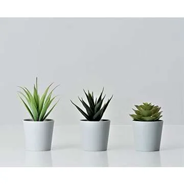 Show moreTransform your living space with the Hejdeco Artificial Mini Succulent Plants Set, a delightful collection that brings a pinch of nature into your home or office. This set features three charming faux plants, measuring 3.15” x 3.15” x 7” inches each, making them the perfect size to fit into any nook or cranny in your decor. The assortment includes stunning designs like Agave, Aloe, and Echeveria Laui, each expertly crafted to mimic the beauty of real succulents without the maintenance hassle. Their sleek light grey pots add a modern touch, making these mini plants a versatile decor solution for any setting.