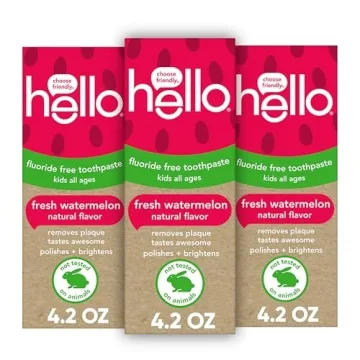 Show more The Hello Natural Watermelon Flavor Baby & Kids Fluoride Free Toothpaste is an innovative and delightful addition to your child's oral hygiene routine. Specially crafted for young smiles, this fluoride-free toothpaste features a delicious watermelon flavor that kids adore, turning brushing into a fun and enjoyable experience. Available in a convenient pack of three (3) 4.2 oz tubes, this toothpaste is perfect for families, ensuring you have an ample supply for countless brushing sessions. With a vegan and gentle formula that's free from SLS and other harsh chemicals, this toothpaste guarantees peace of mind for parents looking for safe and effective oral care solutions.