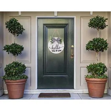Show more Welcome to your new favorite outdoor decor piece! The Hello Sign Rustic Front Door Decor is not just a sign—it's a statement of warmth and hospitality that instantly enhances the charm of your entryway. Crafted from high-quality wood, this round welcome sign artfully showcases a clean and elegant design, complete with a stylish black and white buffalo check ribbon and delicate eucalyptus greenery. Measuring 11 inches in diameter, it's the ideal size to make a cozy yet eye-catching impression without overwhelming your space. Whether you're looking to spruce up your front porch for spring or keep things welcoming throughout the year, this sign perfectly fits the bill.