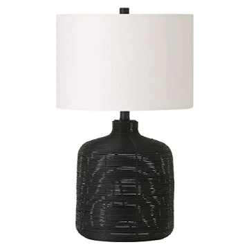 Show moreIlluminate your space with the stunning and stylish Henn&Hart 20.5" Tall Petite/Rattan Table Lamp. Designed with a modern coastal aesthetic, this lamp effortlessly adds a touch of elegance to your living room, workspace, or even as a bedside companion. The handcrafted black rattan finish gracefully contrasts with a white drum fabric shade, offering a warm and inviting glow to any room. Perfectly sized for small spaces, this table lamp is not only a practical lighting solution but also a beautiful accent piece that showcases sophistication and contemporary style.