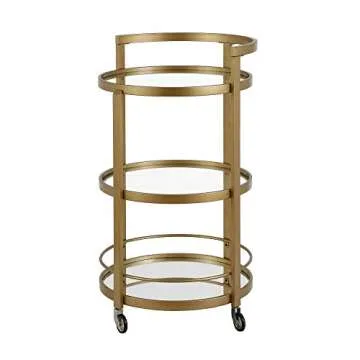 Show moreElevate Your Entertaining Experience with the Henn&Hart 21" Wide Round Bar Cart in Brass, where modern design meets functionality. Perfectly blending elegance and creativity, this round bar cart is not just a storage solution but a statement piece for your home. Equipped with ample space to house your favorite beverages and spirits, it measures 21" in diameter, allowing you to maintain a sleek profile while providing maximum utility. With sturdy construction and designer looks, this bar cart is crafted to support larger bottles up to approximately 13" tall on its lower shelves, ensuring you have easy access to all your essentials while preparing cocktails.