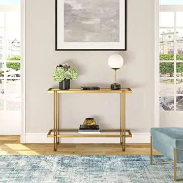 Show moreTransform your entryway or living space with the exquisite Henn&Hart 42" Wide Rectangular Console Table. This stunning piece seamlessly blends contemporary elegance with timeless charm, making it a perfect addition to your home decor. The handcrafted brass finish applied to the sturdy steel frame not only promises durability but also adds a metallic sheen that brightens any room. Measuring 42 inches wide, 14 inches deep, and 30 inches high, this console table offers a generous surface area atop a durable tempered glass top, designed to hold up to 50 lbs with ease.