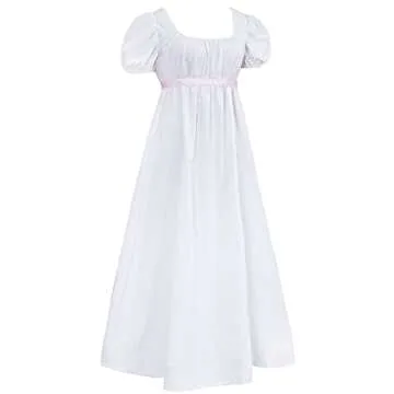 HEQU Regency Dresses for Women with Satin Sash Ruffle Empire Waist Dress Gown (S, White)