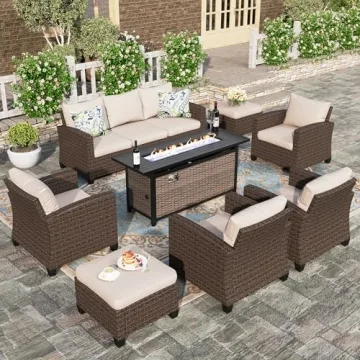 Show more Elevate your outdoor gatherings with the HERA'S HOUSE Patio Furniture Set, a complete package designed for comfort, style, and versatility. This exquisite 8-piece set features an inviting layout with one spacious 3-seat sofa, four individual sofas, two ottomans, and a stunning 56" fire pit table that acts as a centerpiece for any outdoor gathering. Perfect for deck or backyard, this carefully crafted set seamlessly blends sophistication with functionality. Not only does it make a statement, but it also ensures you and your guests can relax in comfort for hours, making it an essential addition to your outdoor oasis.