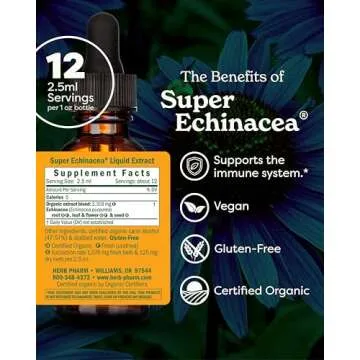 Show moreIntroducing the Herb Pharm Certified Organic Super Echinacea Liquid Extract, your ultimate herbal ally for robust immune system support! This exceptional formula is crafted from a unique blend of certified organic extracts derived from all four parts of the Echinacea purpurea plant: roots, leaves, flowers, and stem. This comprehensive approach ensures that you are harnessing the full spectrum of Echinacea's benefits, promoting optimal health and vitality with every drop. The elixir is meticulously prepared using High-Performance Thin Layer Chromatography (HPTLC) analysis, which guarantees impeccable potency and quality in every vial.