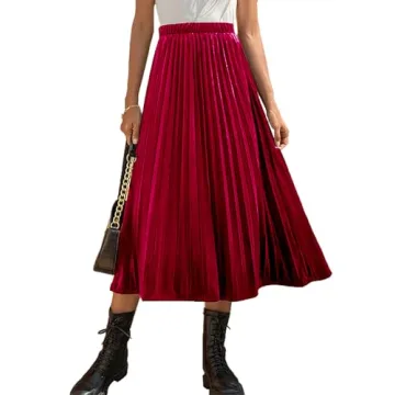 HERBATOMIA Women’s Pleated Midi Velvet Skirt High Elastic Waist A Line Casual Swings Red Long Skirts