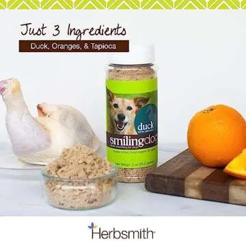 Show moreIntroducing the Herbsmith Kibble Seasoning – Freeze Dried Duck, a revolutionary dog food topper that transforms even the pickiest of eaters into enthusiastic diners. Tailored for discerning dogs, this 3oz culinary delight features real, USDA-inspected duck paired with an array of human-grade fruits and vegetables, ensuring every sprinkle feeds both their taste buds and their well-being. Crafted with care in the USA, this product not only charms your pup but also offers you peace of mind knowing they are consuming whole food ingredients sourced responsibly.