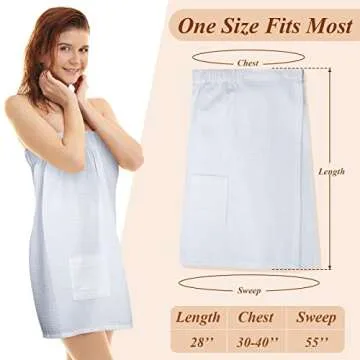 Designed with practicality in mind, our spa wrap features a convenient buckle design that prevents the robe from slipping off, allowing you to move freely without any wardrobe malfunctions. Measuring 28 inches in length with a lower hem of 55 inches, these robes are designed to fit most women and girls comfortably. The adjustable elastic ensures that you can tailor the fit to your personal preference, adding to its versatility as a must-have accessory.