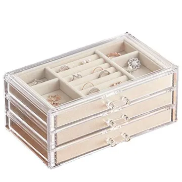 Show moreIntroducing the HerFav Acrylic Jewelry Organizer Box, an exquisite blend of functionality and elegance. This beautifully crafted jewelry box features three spacious drawers, each fully lined in soft velvet to cradle your most cherished accessories. The meticulously designed rectangular shape offers dividers tailored to accommodate everything from delicate earrings to chunky bangles and layered necklaces, ensuring your collection remains impeccably organized and easily accessible. Imagine being able to view your treasured items through the transparent ring divider sections, allowing you to locate your favorites without the usual rummaging.