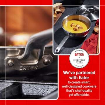 Show more Introducing the Heritage Steel x Eater 10 Piece Cookware Set, an exceptional kitchen companion tailored for passionate cooks of all experience levels. This exquisite set exemplifies a perfect blend of functionality and elegance, crafted meticulously to transform any culinary experience into a delightful adventure. With over 40 years of expertise, this American-made cookware is expertly designed from high-quality stainless steel that not only offers unparalleled durability but also enhances the flavor of your favorite dishes. Each piece is guaranteed to withstand the test of time and elevate your cooking game to new heights.