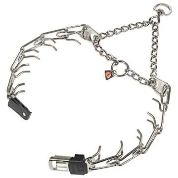 Show more The Herm Sprenger Dog Training Prong Collar is the ultimate training solution that dog owners have been searching for. Crafted in Germany by the esteemed brand Herm Sprenger, this collar is designed with both functionality and comfort in mind. The innovative ClicLock fastener not only provides easy application, eliminating the hassle of sliding it over your dog’s head, but also ensures a secure fit that’s adjustable to accommodate neck sizes up to 20 inches. Its unique 360-degree swivel ring prevents tangling, making walks stress-free and enjoyable. The collar's ability to apply gentle, effective correction promotes superb leash manners, allowing better communication between you and your dog.