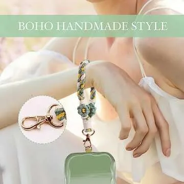 Show more If you are on the hunt for a stylish and functional accessory, look no further than the Boho Macrame Style Cell Phone Lanyard! This beautifully crafted lanyard is made from soft cotton cord and features a durable metal lobster clasp, all delicately intertwined with stunning handmade daisies. Designed with both fashion and functionality in mind, this wrist strap is the perfect blend of chic and convenience.