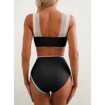 Herseas Women's Black Contrast Trim Bikini Sets 2 Piece High Waisted Swimsuit Square Neck Modest Bathing Suit Wireless Swimwear Medium
