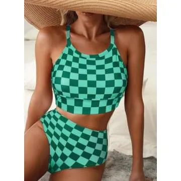 Herseas Womens Tankini Sets High Neck Top Floral Print Bikini Bottom High Rise 2 Pieces Swimsuits Cute Teen Tummy Control Green Checkerboard Bathing Suits Large