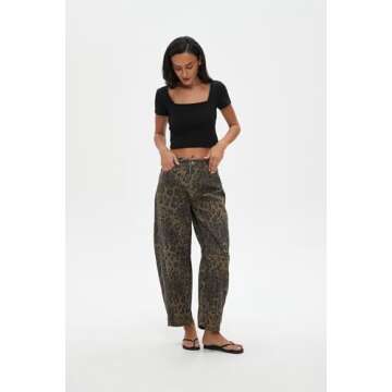 Hesaco Leopard Print Jeans for Women - Mid Rise Barrel Leg Vintage Denim Pants